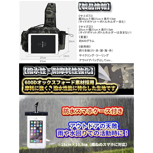 【商品説明】釣りを主に、アウトドアシーンでの使用を最大限に生かす設計のショルダーバッグです。ショルダーバッグとしてはもちろん、ハンドバッグやウエストベルトが付属しているため安定した持ち運びを可能にしたバッグです。ロッドホルダー付き(取り外し可)でフィッシングシーンでのスムーズな移動やラン&ガンの実現を可能にしたバッグです。ボトルホルダーが設計されているのでストレスなくドリンクを持ち運び事ができ熱中症対策が可能です。