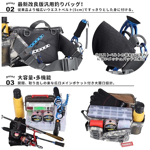 HAKAWAFLY(ハカワフライ)釣り バッグ 広口 大容量 ウエストバッグ 幅広 フィッシングバッグ 5WAY タックルバッグ 防水 ヒップバッグ 多機能 着脱/左右可能なショルダーバッグ パッド式 撥水加工 ロッドホルダー2点とカラビナ5点付き(グレーカモフラージュ)