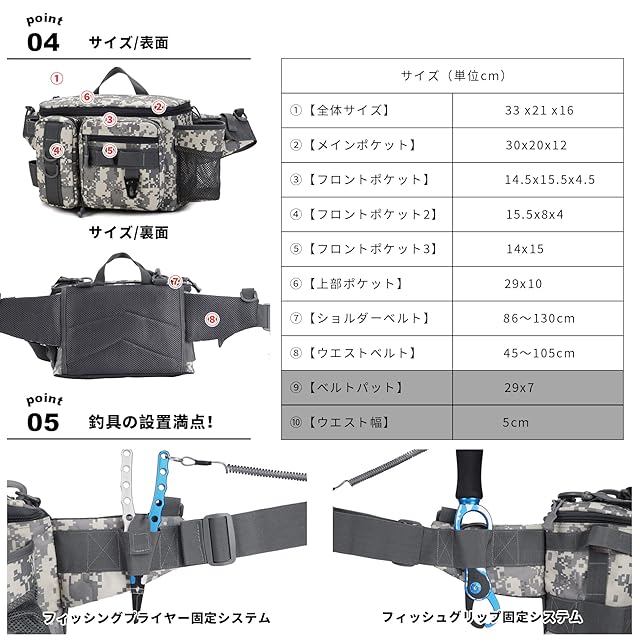 【最新版フィット感・固定感UPの釣り バッグ】釣り ウエストバッグを身に着けた状態で「ズレ落ちにくく」フィット感・固定感が弊社は重視設計としました。ウエストベルトの端末には蒸れに強いメッシュパッド仕様に従来品より幅広いウエストベルト(5cm)ですっきりとした、腰にしっかりとフィットして、ブレない釣り ヒップバッグ。5WAY式、フィッシングバッグ・ショルダーバッグ ・ ウエストバッグ ・ ハンドバッグ ・ メッセンジャーバッグ としてもおすすめです。ロッドベルト2点とカラビナ5点付きで最大3点のロッドを固定でき,タモ網も簡易ロッドホルダーを利用可能です。
