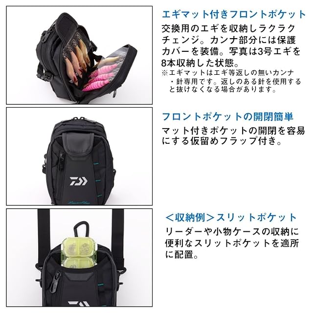 要所に引き裂きに強いダブルリップストップナイロン生地採用「エギマット付きフロントポケット」収納量例:3.5号までのエギ6本程度+小物ケース1個小物収納にぴったりな「スリットポケット」を適所に配置