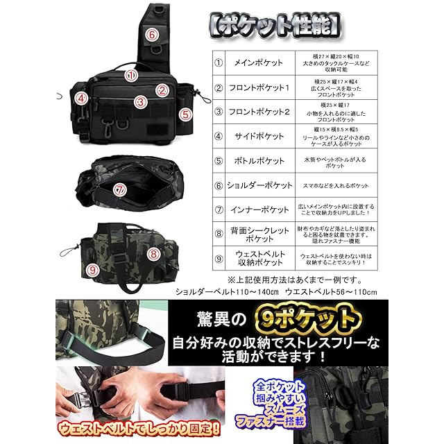【商品説明】釣りを主に、アウトドアシーンでの使用を最大限に生かす設計のショルダーバッグです。ショルダーバッグとしてはもちろん、ハンドバッグやウエストベルトが付属しているため安定した持ち運びを可能にしたバッグです。ロッドホルダー付き(取り外し可)でフィッシングシーンでのスムーズな移動やラン&ガンの実現を可能にしたバッグです。ボトルホルダーが設計されているのでストレスなくドリンクを持ち運び事ができ熱中症対策が可能です。