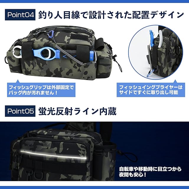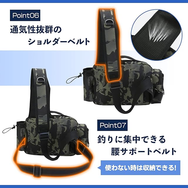 サイズ 27×20×13cm ・ウエスト、ショルダー、手提げバッグとしても使用可能で釣り中の便利さを追求し、前掛けでも後ろ掛けでもご使用いただけます。その他のご使用例として、渓流、バス釣り、アウトドアやキャンプ、旅行など普段使いでもお使いいただけます。また自転車移動や歩いている際にもしっかり固定ができ、安心してお使いいただけます。