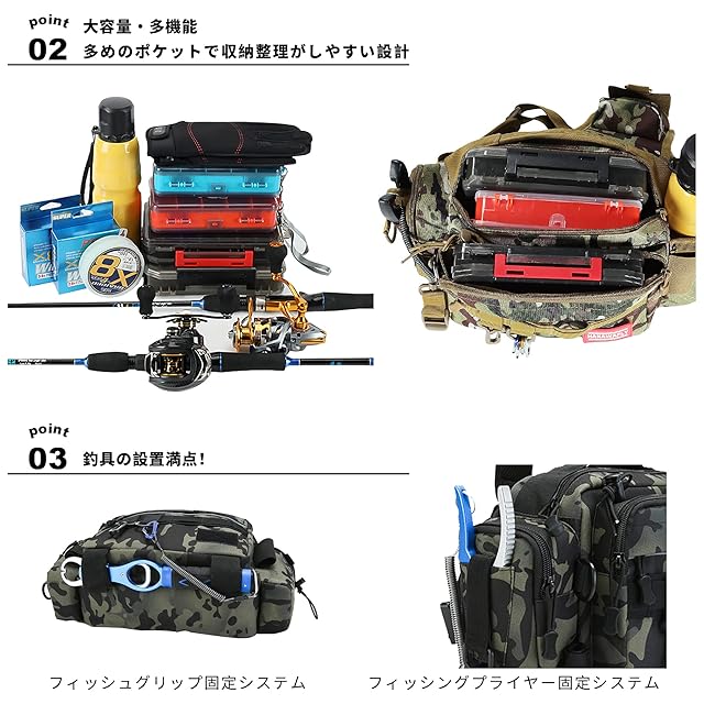 【ロッドベルト2点とカラビナ5点付き釣り専用フィッシングバッグ】反射蛍光素材で背負った状態で電車、自転車やバイクなどで釣行や夜釣りが面白いことも出来るのであらゆる場面に対応します。 釣りだけに限らず、晴天、雨天、強風に係わらず渓流釣り、堤防夜釣り、船釣り、海釣り、ショアジギング、道具収納バッグ、ハイキングピクニック、釣りの小物ルアー入れなどに最適する多機能釣り用バッグ。日常生活中で、収納バッグ、ツールバッグ、ボディーバッグ、チェストバッグ、ウエストポーチ、ショルダーポーチとしても使えます。ファスナーは表面にはコーティング加工が施されており、サビを予防しています。あらゆるフィッシングシチュエーションにフル対応。ソルトでもフレッシュでも使い勝手を考慮した機能を徹底追及。
