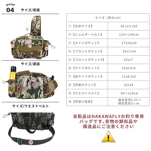 商品名:HAKAWAFLY フィッシングバッグ5WAY ロッドベルト2点とカラビナ5点付き 釣りバッグ 防水 タックルバッグ 多機能 大容量 ランガンバッグ (ウッドランドカモフラージュ)