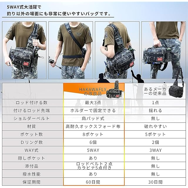 【2023年最新版釣り専用釣りバック5WAY式大活躍と最大3点ロッドを付ける】5WAY式、フィッシングバッグ・ショルダーバッグ ・ ウエストバッグ ・ ハンドバッグ ・ メッセンジャーバッグ としてもおすすめです。3点で固定できる簡易ロッドホルダーを利用可能です。軽量で大容量、機能性にも優れるバック。メンズ、レディース、男女問わず、どんな移動シーンでもどんなスタイルでも対応できますタックルバッグ。反射蛍光素材追加でアウトドア、スポーツ、旅行、釣り、山登り、通勤、サイクリング、バイク、自電車、自転車、ウォーキング、など様々な用途に活躍する非常に使いやすい釣りバックです。