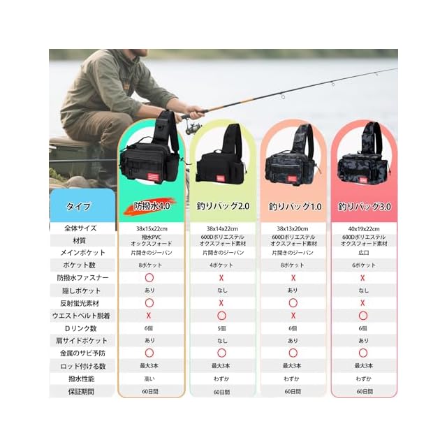【注意】防撥水4.0の釣りばっぐは改良した新たな新製品なので、ご注文の際には間違いのないようにお願い申し上げます。【安心なアフターサービス提供】 弊社は製品の品質向上に努めております。ご注文いただいた商品には60日間の品質が付いており、ご購入の商品は不良品や気に入らない場合は、ご遠慮なくメールで弊社までご連絡ください。交換など迅速に対応させていただきます。弊社では24時間以内にお客様にご満足いただけるよう親切丁寧に返信させていただきます。
