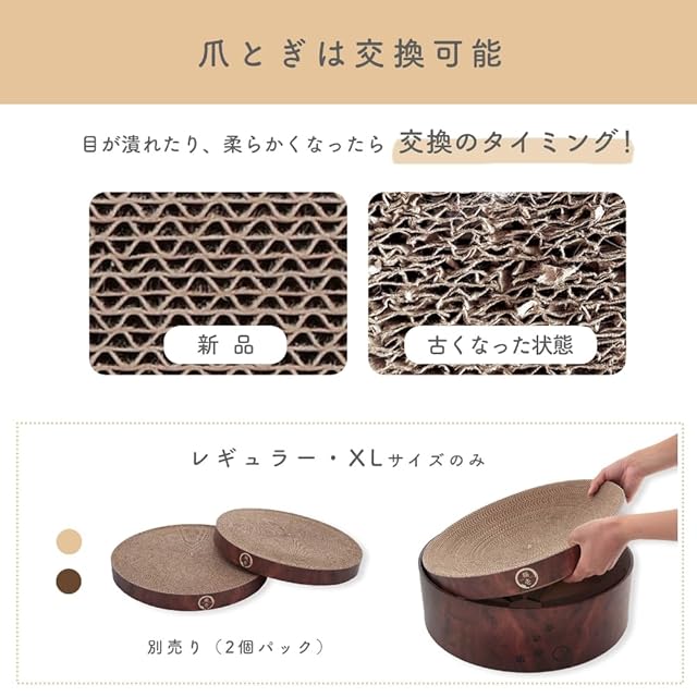 【つめとぎ部分は交換可能。長く使えるつめとぎ】つめとぎダンボール部分のみ交換用を2個セットで販売しております。 はつめとぎ部分のみ交換できるので、経済的です。 交換も、枠組み底面に空いた穴から手でポンとつめとぎ部分を押して取り出してあげるだけ。 とっても簡単に交換できます。