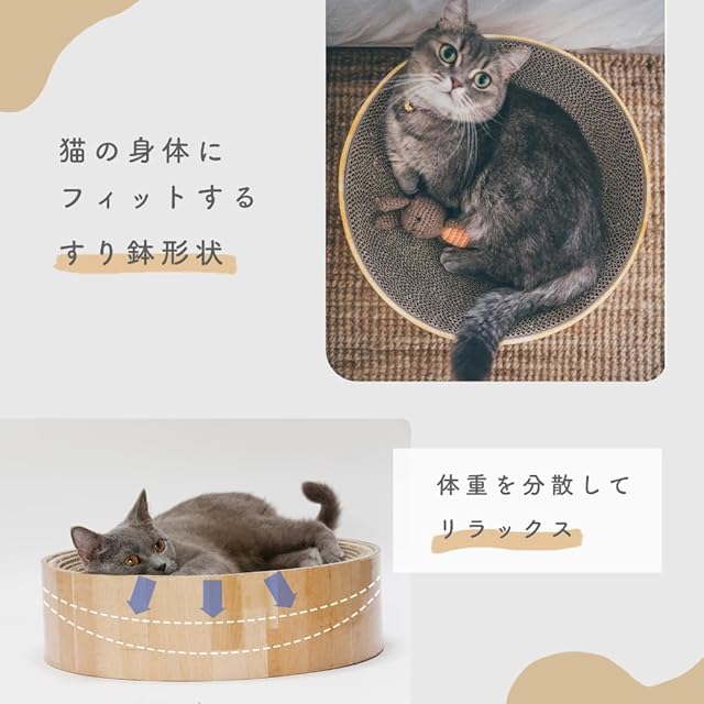 【「からだフィット構造」のすり鉢型ベッド】つめとぎダンボール部分は、優しいカーブを描く、すり鉢構造になっています。 猫のやわらかいカラダにぴたりとフィットするので、寝心地抜群。 土台となる枠組み内部には、キレイなすり鉢構造を作る「脚」がついているので、使用中にすり鉢構造が崩れてしまう心配もございません。