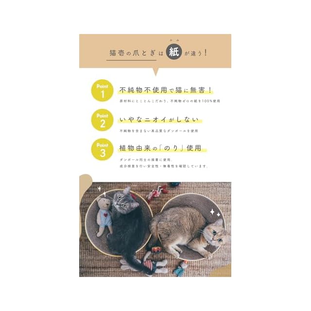 【接着には植物由来の糊を使用】接着には化学素材の糊を使用せず、植物由来の糊を使用しています。 バリバリボウルでつめとぎやくつろぎ時間を楽しんだ後、毛づくろいのために、カラダを舐めても、自然素材なので安心です。 ※とうもろこしアレルギーがある猫ちゃんの場合、ご使用には獣医師にご相談ください。