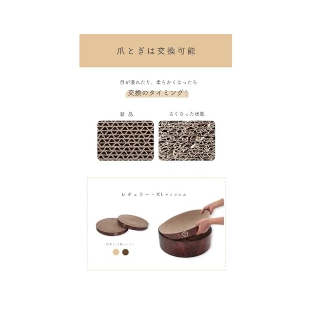 【XLサイズもつめとぎ部分は交換可能】バリバリボウルの特徴であるつめとぎ部分のみの交換、XLでも可能です。 交換用つめとぎとして販売しています(別売り)。 猫のつめとぎは消耗品だからこそ、長く使っていいただけるよう、工夫しています。
