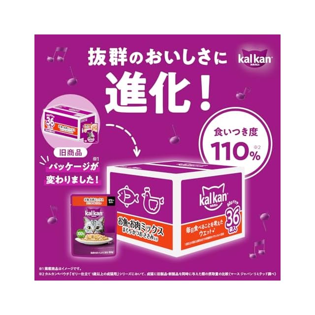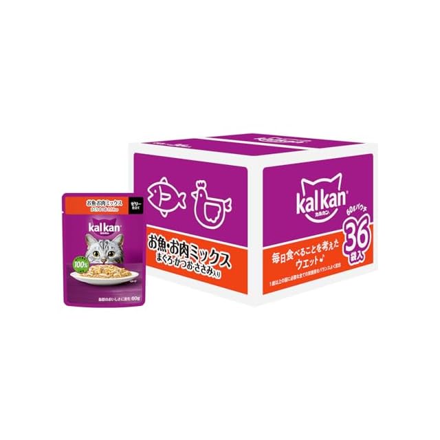 商品名:カルカン パウチ 1歳から 60g×36袋 お魚・お肉ミックス まぐろ・かつお・ささみ入り 成猫用 ウェットフード キャットフード 総合栄養食 水分補給 毎日食べることを考えたウェット 猫 kal kan 大容量 まとめ買い 新カルカン 【.co.jp限定】