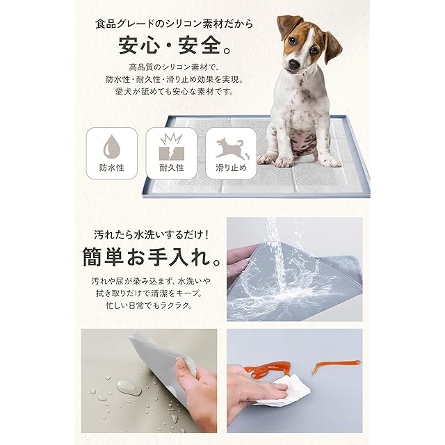 ≪獣医師監修≫いぬのくらしのシリコントイレマットは防水性が高く清掃も簡単で、食品グレードのシリコンを使用しているため安心してご使用していただけます。 また、様々なシーンで活用できわんちゃんの生活を快適にしてくれます。 シリコントイレマットを敷くことで滑りにくくなり、関節への負担も軽減されるので足腰の弱いわんちゃんやシニア犬にもお勧めです。