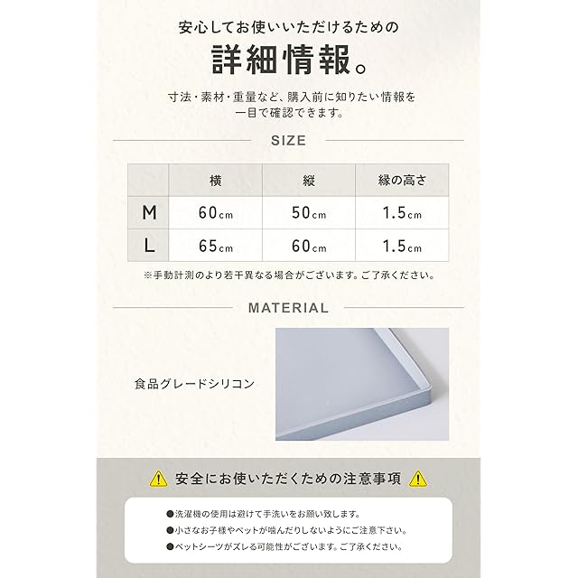 【商品の仕様とカラーバリエーション】 素材: 高品質シリコン / サイズ: Mサイズ50×60×1.5cm、Lサイズ60×65×1.5cm / カラーバリエーション: グレー・ブラック・ピンク・ベージュ・ライトグレー / 特長: 滑り止め加工・水洗い可能・抗菌仕様・液漏れ防止フチ付き / 用途: トイレトレーニング・高齢犬のケア・食事マット・多用途マット / 安全性: 有害物質不使用・ペット用製品基準クリア