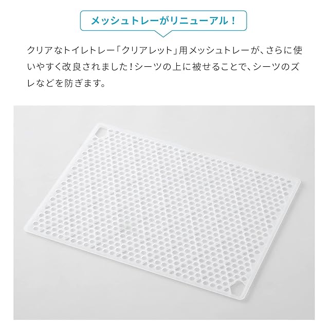 クリアなトイレトレー「クリアレット」シリーズ用メッシュトレーが、さらに使いやすく改良されました。 シーツの上に被せることで、シーツのズレなどを防ぎます。