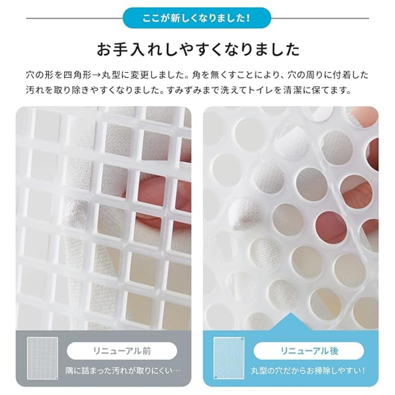 穴の形を四角型→丸型に変更しました。角を無くすことにより、穴の周りに付着した汚れを取り除きやすくなりました。 すみずみまで洗えてトイレを清潔に保てます。