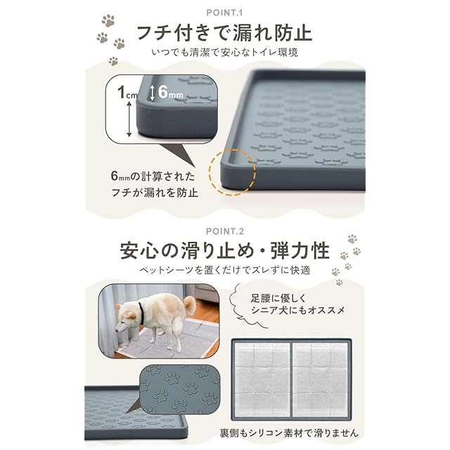 滑らない加工: 密着力が強いシリコンマットは排便パッドを乗せても散らばる心配が無く便利です。