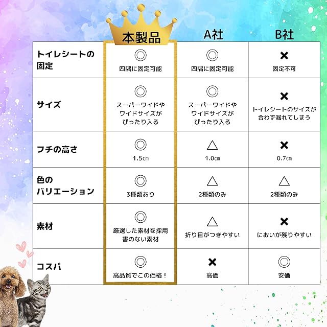 【類似品との違い】4つの隅にトイレシートを固定するホルダーがついているため、シーツが剝がれにくくなっています。また、ホルダーの高さは1.5㎝あるため水が漏れにくく、お掃除の手間を減らします。最低限の高さであるため、躓きにくいちょうどいい高さとなっています。