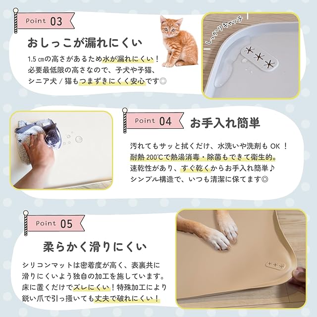 このようなお悩みはありませんか? ・おしっこがトイレシートの外にはみ出る ・トイレシートがすぐにズレる ・プラスチック製のシートホルダーはお手入れが煩雑/高さがあるため躓く ・ご飯や水をこぼしながら食事をする ・フローリングやお風呂場などで滑ってしまう シリコンマットはそんなお悩みを解決します! 食べこぼしやおしっこ失敗にもう悩まない! 1.5㎝のフチがあるためこぼれません!汚れてもさっと拭くだけ! たくさんのお客様に選ばれています! 当社のシリコンマットが選ばれる5つの理由 ポイント①トイレシーツを四隅に固定可能! 4つの角にトイレシートを固定するホルダーがついているため、シーツが剝がれにくい!ホルダーに固定しなくてもトイレシートがズレにくいよう設計しています。 愛犬がトイレシーツの上で動いてもトイレシーツは滑らず動かない! ポイント②安心安全な純シリコン100% 医療現場やベビー用品、食器でも使われている高品質な安心素材を採用。抗菌/防水/撥水素材で汚れにくい。環境にやさしく無毒でBPAフリーだから愛犬が舐めても安全。柔らかい素材であるため踏んでも安心! ポイント③高さがあるため漏れにくい 1.5㎝の高さがあるため水が漏れにくい!必要最低限の高さであるため、子犬やシニア犬も躓きにくい。 ポイント④お手入れ簡単 汚れたらタオルで拭き取ったり、さっと水洗いまたは洗剤でお手入れOK!速乾性があるためすぐに乾きます。耐熱性も優れており、200℃まで耐えられるため熱湯消毒も可能!定期的に熱湯で除菌することでにおいが消え、衛生的なペットマットを長く使用可能!シンプル構造だからお手入れラクラク♪いつも清潔に保てます ポイント⑤柔らかく滑りにくい シリコンマットは密着度が高く、表裏共に滑りにくいよう独自の加工を施しています。床に置くだけでズレにくい!特殊加工により鋭い爪で引っ搔いても丈夫で破れにくい!