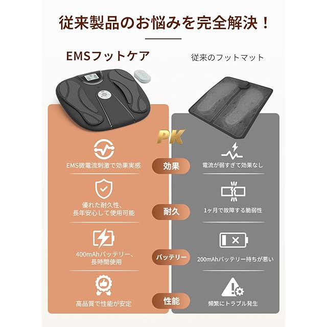 【超耐久設計で長く愛用できる品質】お客様の声を元に、一般的なEMS機器の弱点を徹底分析し、旧モデルの「電流が弱い」「故障しやすい」「バッテリー持ちが悪い」という3大課題をすべて解決。最新チップで安定した強力な電流出力を実現し、故障しにくい強化基板、長時間使用可能な大容量バッテリー、足の形状に合わせて人間工学設計。1年間の期間付きで、安心してお使いいただけます。