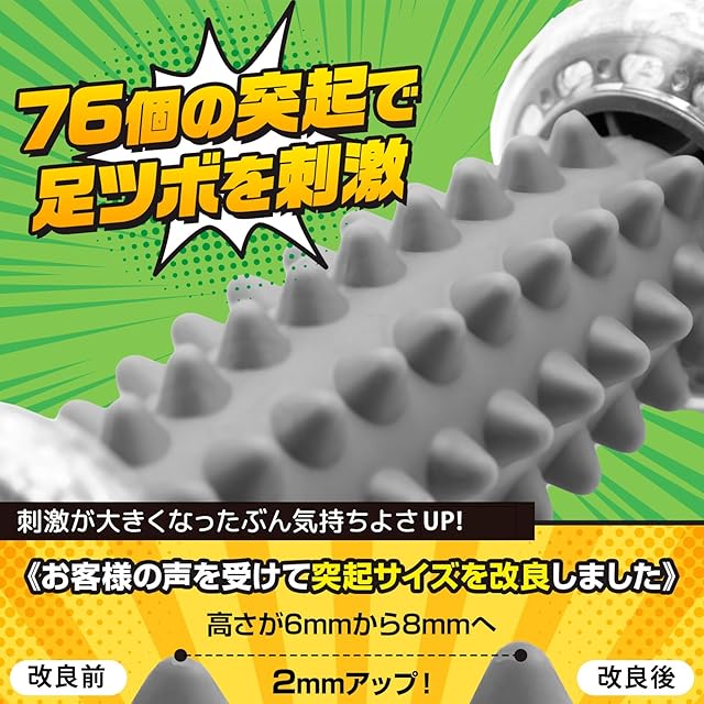 【柔道整復師も推薦】 ちょうど良い硬さの76個の突起が 足つぼ をグイグイ刺激!指で指圧されているかのような感覚の 足裏マッサージ ローラー です。足ツボマット や ツボ押し棒など強めの刺激がお好きな方におすすめ。踏み込み具合で刺激を調整出来ます。 青竹踏み つぼ押し棒 足つぼマット などに変わる新しい 足裏 健康器具 です。