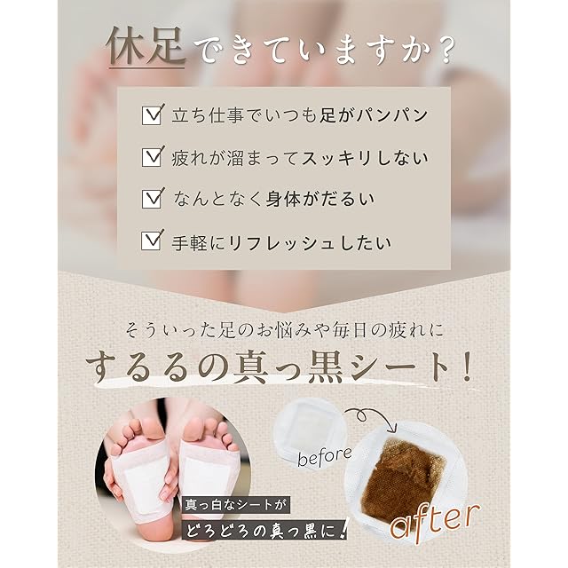 【使い方はとっても簡単】寝る前に足裏に貼るだけ。真っ白だったシートが翌朝まっ黒になっているので見た目でも爽快感を味わえます!