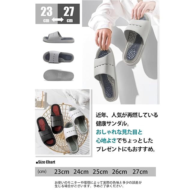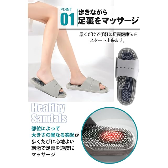 ・【フィット感と快適性の追求】人間工学に基づいて設計された3つの特殊突起(指先用、土踏まず用、かかと用)が、歩行時の衝撃を分散。よくしなるので足の動きにフィットし、 裸足で履いても痛くなりにくく、長時間の使用でも快適な履き心地を維持します。健康サンダルが初めての方にもおすすめです。