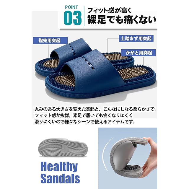 ・【フィット感と快適性の追求】人間工学に基づいて設計された3つの特殊突起(指先用、土踏まず用、かかと用)が、歩行時の衝撃を分散。よくしなるので足の動きにフィットし、 裸足で履いても痛くなりにくく、長時間の使用でも快適な履き心地を維持します。健康サンダルが初めての方にもおすすめです。