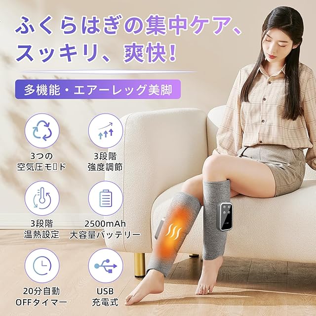【2025新登場・空気圧・温熱】ふくらはぎリラックス エアーレッグリラックス 空気圧 温熱 太もも 足ケア Tpye-C充電式 コードレス 3つ空気圧モード 3段階強度 3段階温度 20分自動オフタイマー サイズ幅調節可 操作簡単 運動後/座り仕事/立ち仕事/長時間の歩きなどに男女適用 家庭用 フィット クリスマス 誕生日 記念日 敬老日 プレゼント 持ち運び便利 日本語説明書 充電ケーブル付属(2pcs梱包)