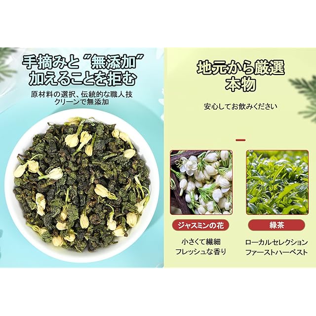 【エレガントな外観】ジャスミン緑茶はエレガントで繊細な外観をしており、茶葉は長く均一で、エメラルドグリーンの色をしており、透明感があり、新鮮なジャスミンの香りを放っています。淹れた後の茶汁は透明で明るく、花のような香りが鼻に抜け、まるで花の海にいるような優雅な香りが長く続き、爽やかで活力を与えてくれます。