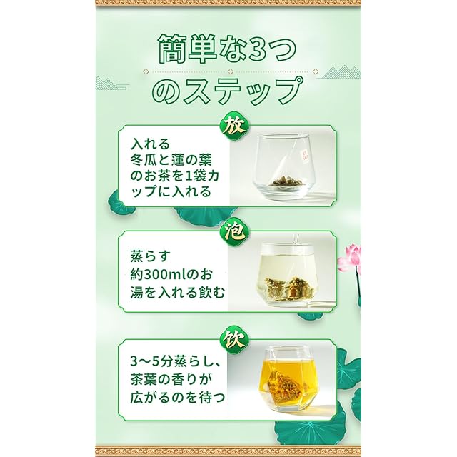 【淹れ方】冬瓜と蓮の葉茶1袋をカップに入れ、約300mlのお湯を加えて3~5分蒸らし、お茶の香りが浸透するのを待ち、気楽に飲む。