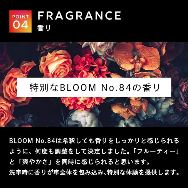 【香り】BLOOM NO.84を採用。洗車時に車全体を良い香りが包み込みます。