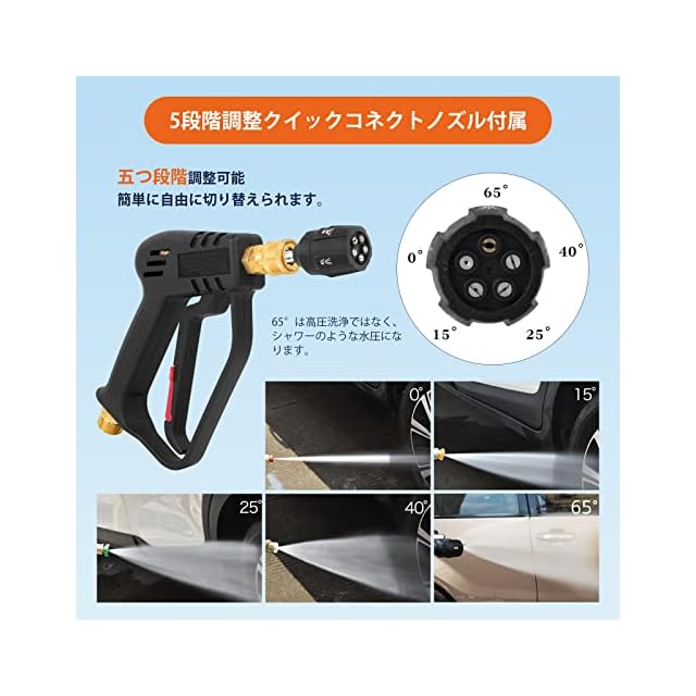 【5段階調整クイックコネクトノズル付き】Akitsuba高圧洗浄機ショートガンセットには、5段階調整可能な1/4"クイックコネクトノズルが装備されています。5つのスプレーモードで、すべての洗浄ニーズに対応します。 スプレーパターンには0°、15°、25°、40°、65°があり、回転させることで必要な角度に調整できます。(65°では、水圧はシャワーのようなものであり、高圧リンスではありません。)。普通の単一ノズルより、交換し必要がなく、便利しか言えません。更に洗浄力も従来品よりもっと強いです。噴射角度を切り替える時、1/4インチクイックコネクトという所を回転しないで、噴射角度標識のあるヘッドを回転してください。