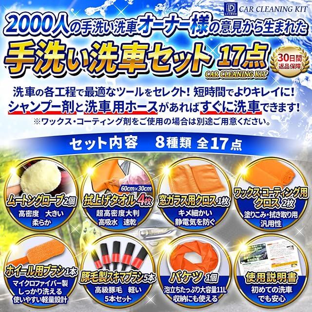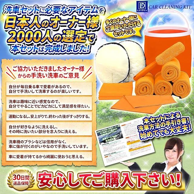 商品名:LuxDee 洗車用品 17点 洗車セット [ 拭き上げ用 マイクロファイバークロス 4枚 洗車ブラシ 豚毛 5本 ムートングローブ 2個 ワックスクロス 2枚 窓ガラス用クロス 1枚 バケツ ホイールブラシ 1本 使用説明書 ] (⓷ 17点 バケツ付き, オレンジ)
