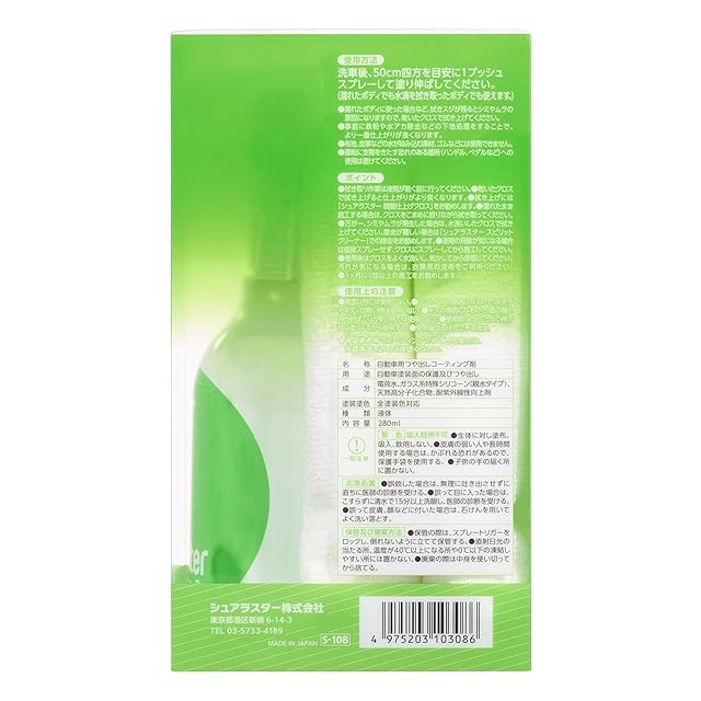 SurLuster(シュアラスター) ゼロウォーター 280ml 親水 ガラス系コーティング 約2ヶ月耐久 艶 光沢 紫外線吸収剤 UV 保護 車 バイク 自転車 簡単施工 洗車 クロス付き スプレーコーティング S-108