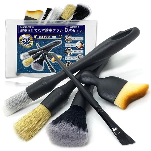 洗車ブラシ 5種類 5本セット 【EASYTOCARRY】ディテールブラシ ホイール ボディ用 洗車グッズ カー用品 便利 傷つかない ロング トラック 筆 豚毛 柔らか バイク 車内