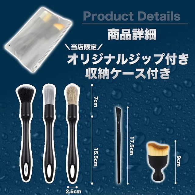 【商品名】洗車ブラシ5本セット 収納袋付き 【使いやすい5種類セット】ディテールブラシは硬さの異なる3本セットで様々なシーンでお使いいただけます。車内の掃除だけでなく、車体、ホイール、掃除が難しい隙間の掃除にも使用できます。 【ソフト】: 柔らかいブラシを使用すると、傷を効果的に防ぐことができます。 【ミディアム】: 豚毛ブラシ。主に車のロゴ、車のグリル、ヘッドライトの隙間、車体の隙間などのやや硬い部分の清掃に使用されます。 【ハード】: ハードの洗車ブラシで狭い隙間や強固な汚れに最適なブラシ。強力な洗浄力で、ホイールハブ、エンジンギャップなどの汚れたディテールを洗浄できます。ハードの洗車ブラシは、車の内部を掃除しないように推奨します。 【マイクロブラシ】:車のエンブレム、レター、ヘッドライトの隙間、車体の隙間など汚れをピンポイントで除去できます。 【ソフトブラシ車内用】主にエアコンの出口、ハンドルの隙間、シートの隙間、革の表面などに使用できます。