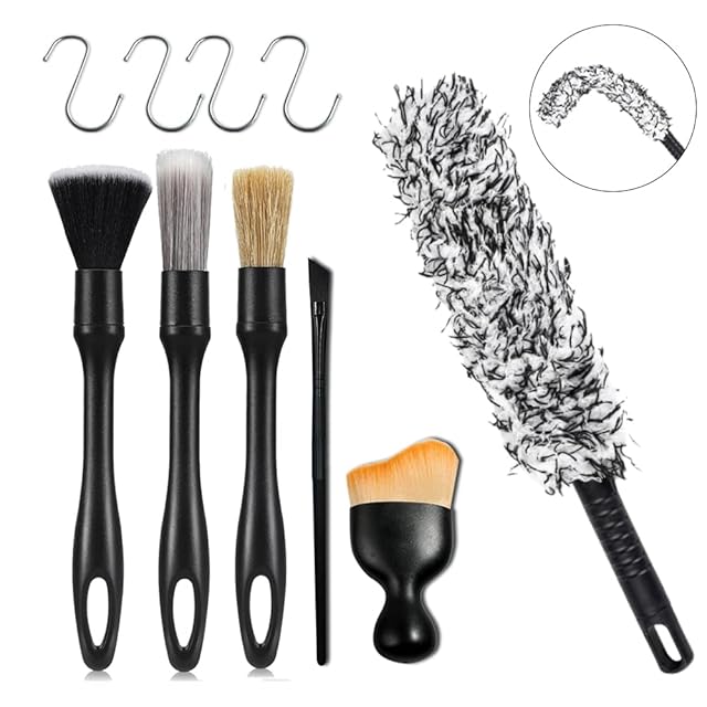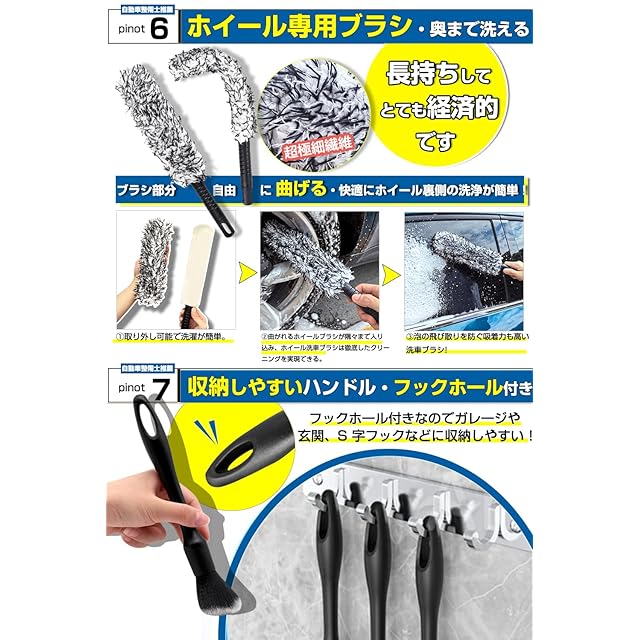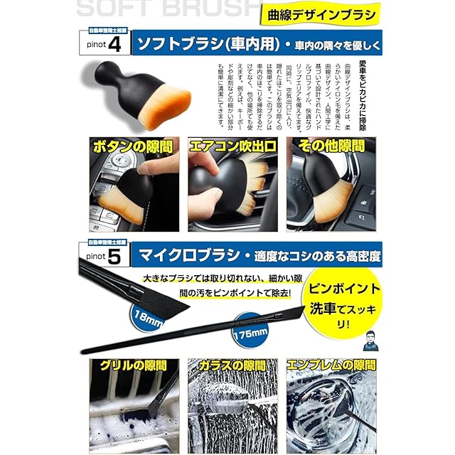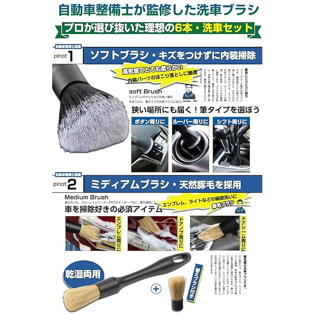 【自動車整備士推薦 6種類 6本セットの洗車ブラシ】:✅【ソフトブラシ】: 柔らかいブラシを使用すると、傷を効果的に防ぐことができます。✅【ミディアムブラシ】: 豚毛ブラシ。主に車のロゴ、車のグリル、ヘッドライトの隙間、車体の隙間などのやや硬い部分の清掃に使用されます。✅【ハードブラシ】: ハードの洗車ブラシで狭い隙間や強固な汚れに最適なブラシ。✅【マイクロブラシ】:車のエンブレム、レター、ヘッドライトの隙間、車体の隙間など汚れをピンポイントで除去できます。✅【ソフトブラシ車内用】主にエアコンの出口、ハンドルの隙間、シートの隙間、革の表面などに使用できます。✅【ホイール専用ブラシ】平たい芯にモフモフした埃取りが被せてあります。平たく曲がる埃取りは、洗濯機の下の掃除に便利です。ホイールブラシだけど、洗面所に使うと便利でした。