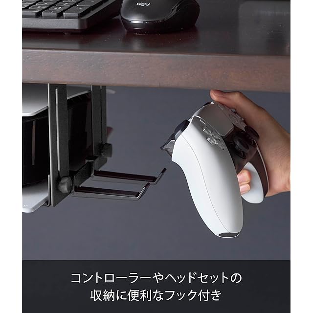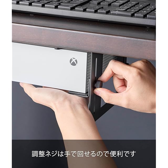 場所をとるゲーム機をデスク下に収納。可動式の固定ホルダーは斜めにも固定することができるので様々な形状のゲーム機が収納可能!デスク下に浮かせて収納できるので、ほこりが溜まりにくく床の掃除もラクラク。可動式の固定ホルダーは手で回せる調節ネジなので、調節しやすく便利です。付属のフックはお好みの位置に取り付け可能でコントローラーやヘッドセットの収納におすすめです。ゲーム機を設置の際、大きな開口部があるので排熱を妨げず冷却効果が保て安心です。ゲーム機をキズつけないシリコーン付き。デスクやテーブル、キッチンカウンター下に木ネジを使って取り付ける仕様です。