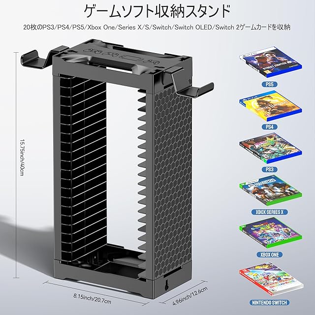 商品名:ゲームソフト 収納 スタンド 1層 20枚 PS5/PS4/Switch/Xbox向けの ディスク収納 ラック ヘッドホン コントローラー スタンド 省スペース 横置き 縦置き 壁掛け ゲームカード タワー 簡単組立 大容量