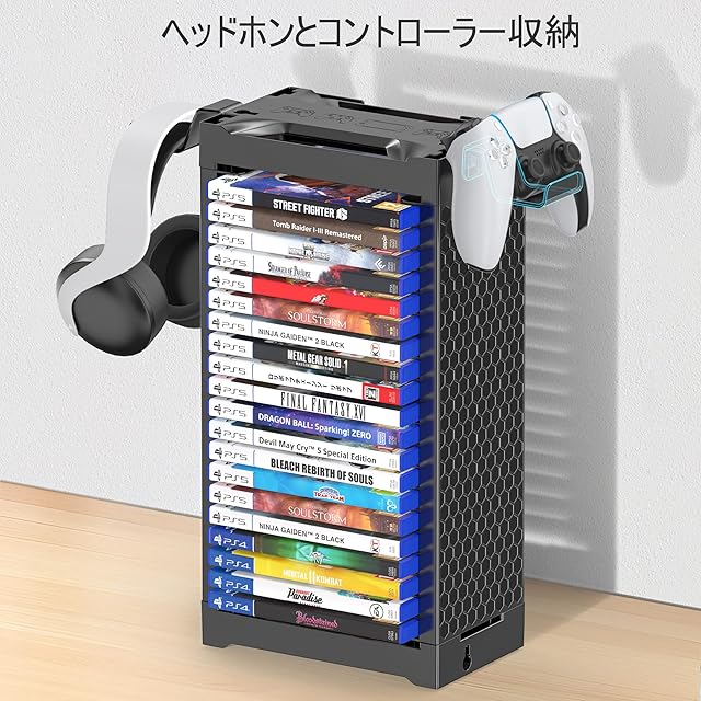 ゲームソフト 収納 スタンド 1層 20枚 PS5/PS4/Switch/Xbox向けの ディスク収納 ラック ヘッドホン コントローラー スタンド 省スペース 横置き 縦置き 壁掛け ゲームカード タワー 簡単組立 大容量