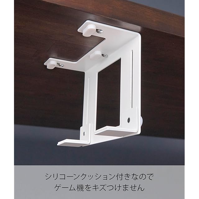 場所をとるゲーム機をデスク下に収納。可動式の固定ホルダーは斜めにも固定することができるので様々な形状のゲーム機が収納可能!デスク下に浮かせて収納できるので、ほこりが溜まりにくく床の掃除もラクラク。可動式の固定ホルダーは手で回せる調節ネジなので、調節しやすく便利です。付属のフックはお好みの位置に取り付け可能でコントローラーやヘッドセットの収納におすすめです。ゲーム機を設置の際、大きな開口部があるので排熱を妨げず冷却効果が保て安心です。ゲーム機をキズつけないシリコーン付き。デスクやテーブル、キッチンカウンター下に木ネジを使って取り付ける仕様です。