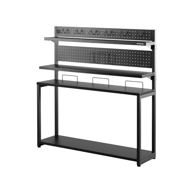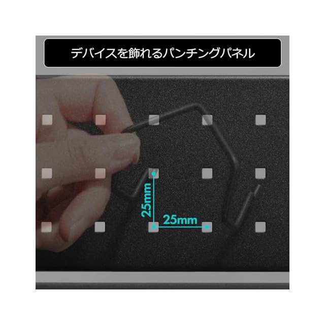 【デバイスを飾れるパンチングパネル】背板にはスチール製のパンチングパネルを採用。付属のフックを引っ掛ければ、デバイスのディスプレイも可能。市販の有孔ボードフック(25mmピッチ用)にも対応します。