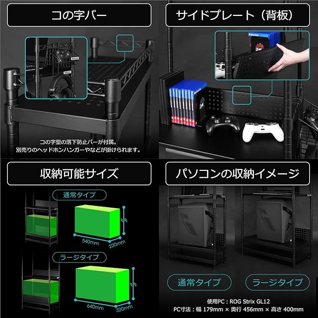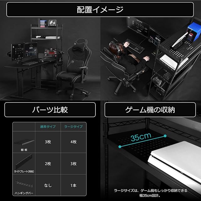 コンパクトに設置できる通常タイプ、大型ゲーミングPCに最適な大容量収納のラージタイプの、選べる2サイズ展開。