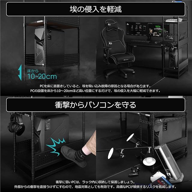 CPUラックとして利用でき、パソコン本体、埃や外部からの衝撃から守ります。ルーター・モデム類やヘッドホンなどデスク周りの小物の収納にも便利です。