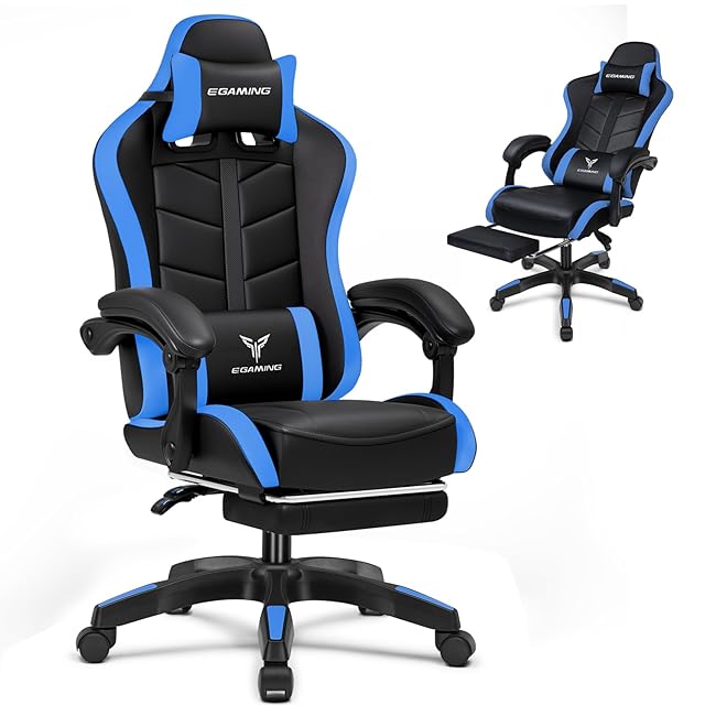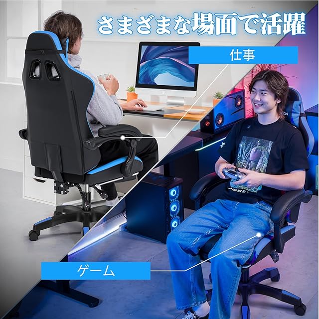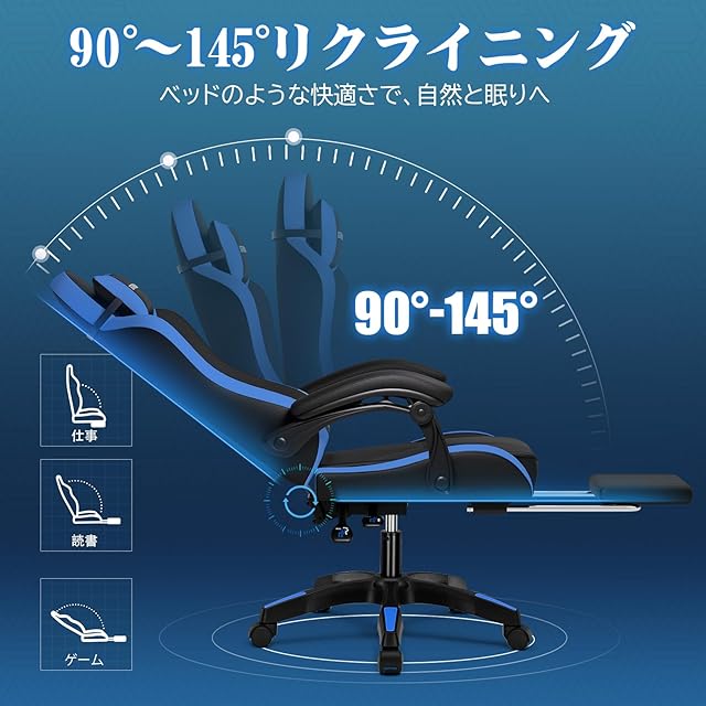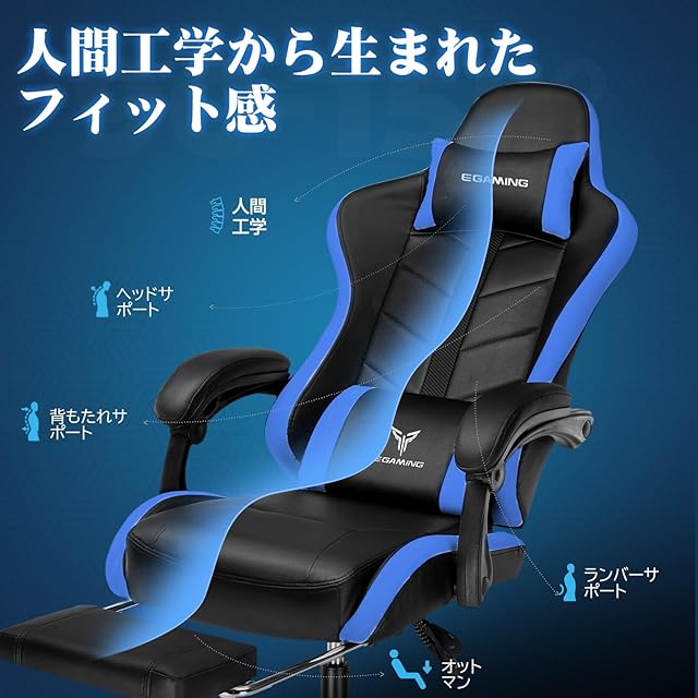 商品名:LUCKRACER ゲーミングチェア デスクチェア pcチェア 椅子 テレワーク 腰痛対策 145°リクライニング 一体式オットマン付き 疲れない ゲームチェア ハイバック ランバーサポート PUレザー EG910F-BLUE