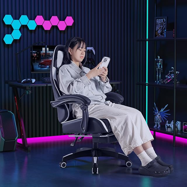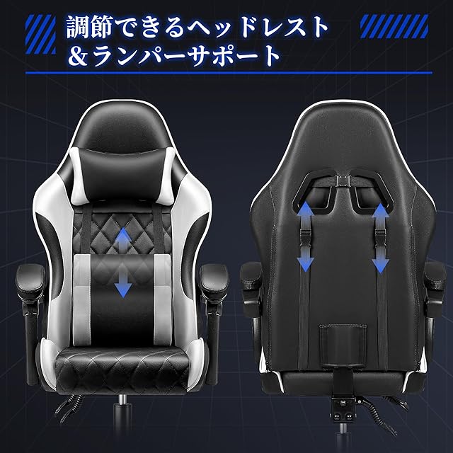 「135°リクライニング強い安定感」最大135°調節、チェア本体の安定性を高めると同時にリラックス効果を最大限に活かす。連動式アームレストと格納式オットマンに合わせて、全身を一所も逃さず支えて、最高なリラックスを提供する。格納式オットマンは使わない時は座面下に収納可能、省スペースで利便である。ざまざまな工夫で、作業とゲームプレイの姿勢や動きの変化、体格に応じて最適なサポートを実現している。オフィスでの休憩や仮眠にもおすすめのゲーミングチェアです。