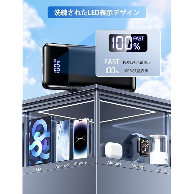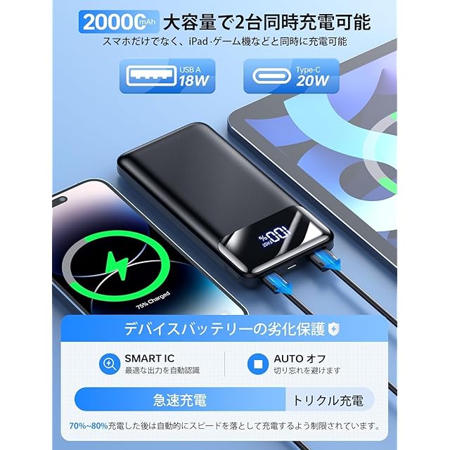 ✈【高い互換性&飛行機内に持ち込み可能】USB-Aポート、USB Type-C(USB-C)ポートをそれぞれ1ポートずつを搭載することで、スマートフォン、タブレット端末、ノートPC等、ほぼすべての機器に対応。低電流モードも搭載されており、Bluetoothヘッドセット、イヤホン等の小型電子機器やウェアラブル機器にも最適な電流で充電することができますので、かなり便利です。また本製品はiPhone、iPadシリーズの急速充電に対応しているため、非対応製品に比べて速く充電できます。航空機内へ持ち込み可能なバッテリー容量により、国内外の飛行機旅行に使え、待ち時間や移動中にも充電することができます。(※航空会社によって容量制限や規定が違う場合がありますので、事前に航空会社のHPでご確認ください。)【パッケージ内容】20000mAh モバイルバッテリー*1、USBケーブル*1、日本語取扱説明書*1