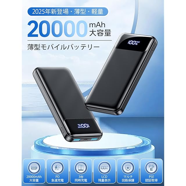 商品名:モバイルバッテリー 【20000mAh大容量・薄さ16mm・PD20W急速充電】モバイルバッテリー 超軽量 小型 QC3.0対応 LED残量表示 最大3台同時充電可能 スマホ充電器 携帯充電器 iPad/iPhone/Android各種スマホ対応 PSE認証済み&安全回路保護 機内持ち込み可能 旅行/出張/アウトドア/キャンプ/停電対策/防災 日本語取扱説明書
