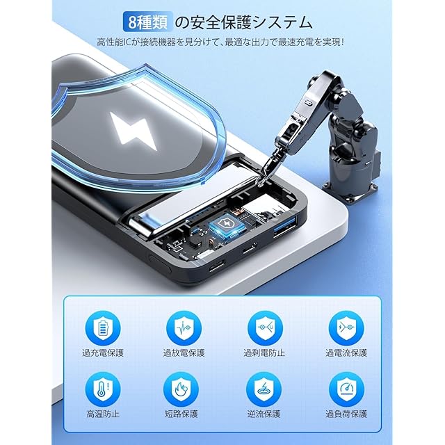 【長く使える安全設計&おまかせ充電機能】長期間安心してお使いいただけるように、本製品はUN38.3に準拠した発火しにくく、より膨れにくい電池の構造技術を採用、過充電・過放電・過電圧・過電流防止機能および短絡保護機能と温度検知機能の6つの保護機能など安心の回路設計を備えました。充電ポートに高性能ICが内蔵されており、接続機器端末(iphone &Android)を自動で見分けて最適な出力で最速に充電できる”お任せ充電”に対応しています。充電が完了したら自動でストップ、電池の過充電を防止、スマホバッテリー寿命を長持ちさせることができます。【PSE安全認証済】日本の電気用品安全法(PSE)の技術基準に適合した安全性の高い商品ので安心・安全に使用いただけます。