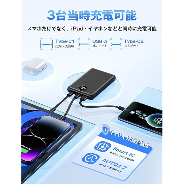 【破格の交換性・飛行機内に持ち込み可能】 本製品はUSB-A出力ポーとType-C入/出力ポートを搭載することで、iPhone/Androidなどのスマートフォンに対応だけではなく、Bluetoothイヤホン、iPadなどのタブレット端末を含め、スマートウォッチも様々な機器を充電できます。幅広い対応機器と共有可能な機能により、さまざまなシーンで活躍することができます。UN38.3(国連勧告輸送試験)基準に合って、飛行機に持ち込むことができて、出張中でも旅行中でも安心して使用できます。小型で持ち運びに便利で、飛行機移動することが多い方にもおすすめです。 ※航空会社によってそれぞれの異なる制限があるため、搭乗予定の航空会社の公式サイトを事前に確認してください。【パッケージ内容】バッテリー本体*1、充電ケーブル*1、日本語取扱説明書*1 。提供します。